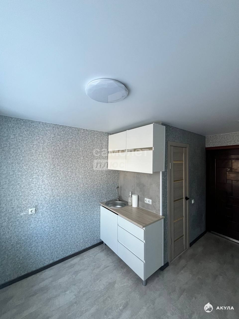 Комната не большая. Есть душевая и санузел, в комнату также проведена вода, есть небольшой кухонный гарнитур. Полностью сделана отделка: натяжной потолок, обои, плитка, душевой уголок. Установлена новая сантехника.