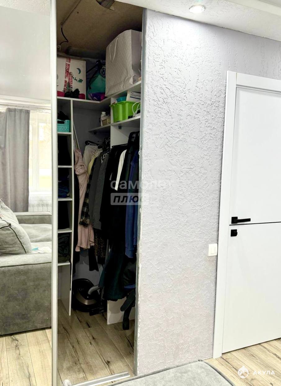 В квартире остается кухонный гарнитур, система хранения в гардеробной комнате и мебель в прихожей.