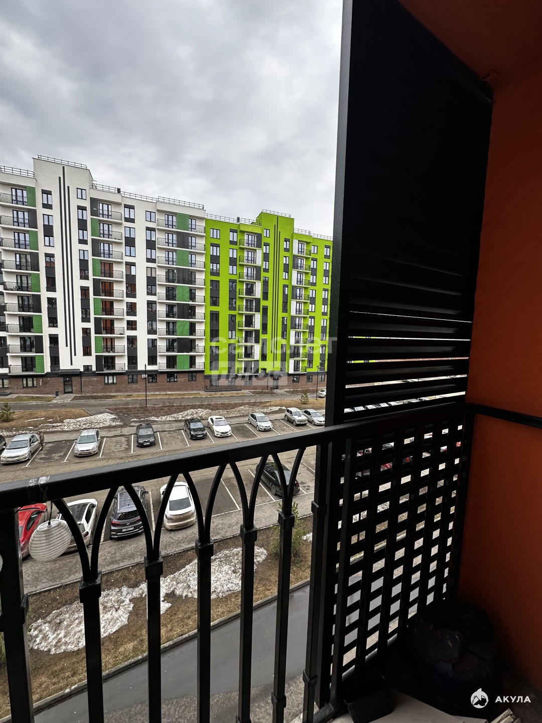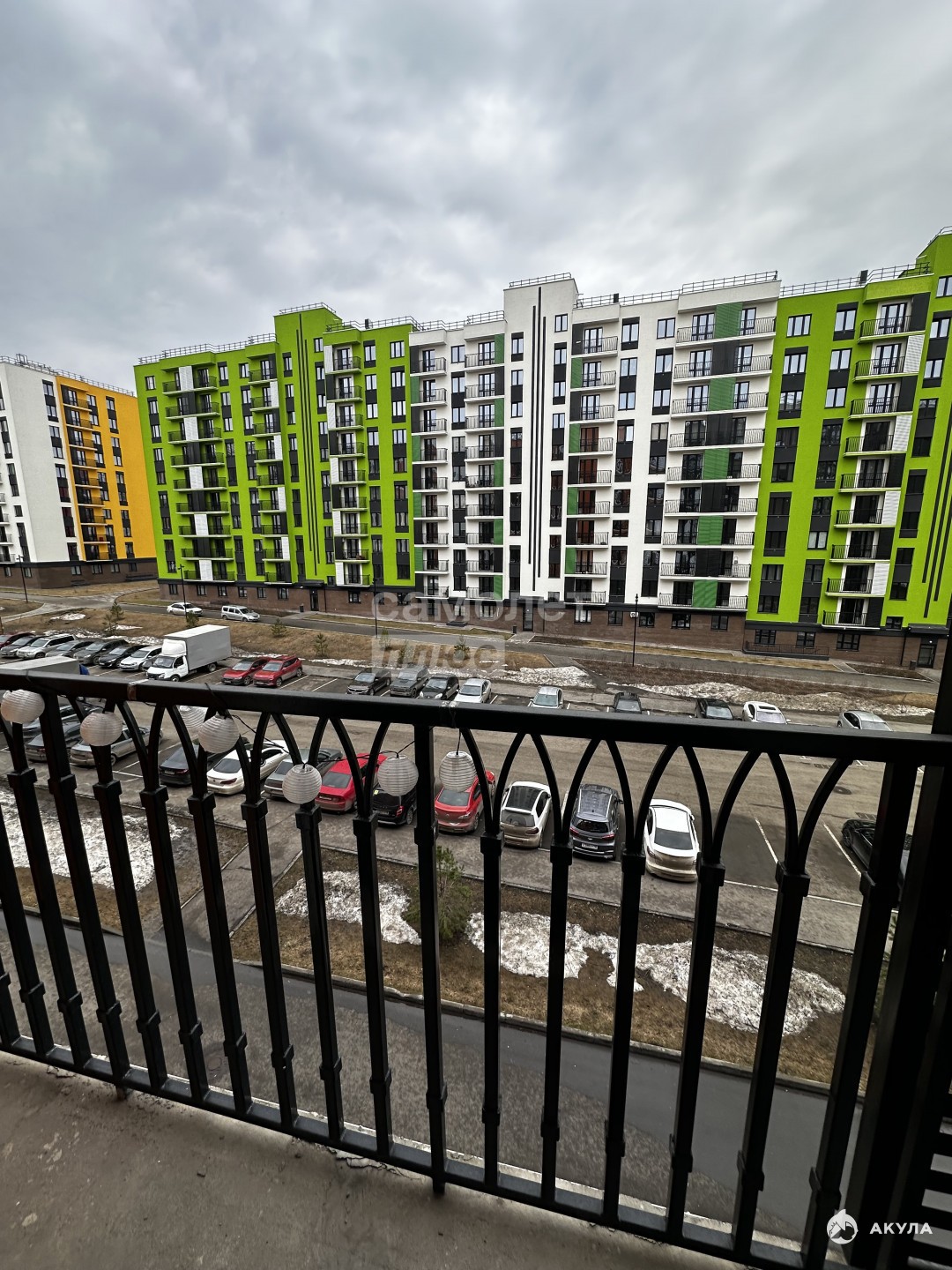 Новый огромный жилой микрорайон, красивый современный двор с одной стороны дома, огромная парковка с другой стороны.